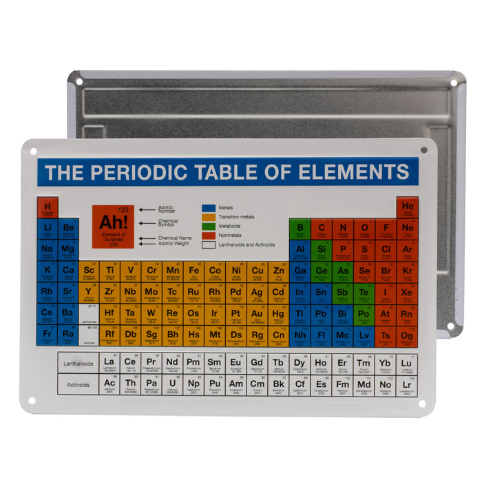 A good place to start, for example, would be to familiarize yourself with the periodic table of elements. To keep it in view at all times, you can simply hang up the periodic table metal sign. Not only is it ideal for memorizing the elements and their properties, it also makes a colourful eye-catcher on the wall. Perhaps it will elicit an " Ah!" from you or one of your guests - the element of surprise that is also hidden on the sign.