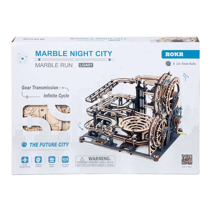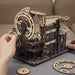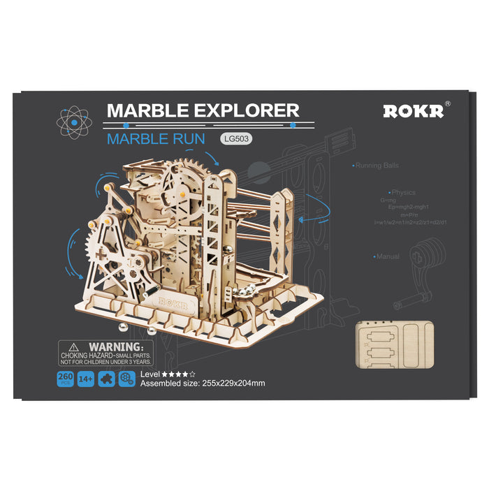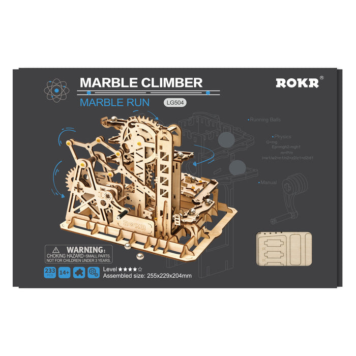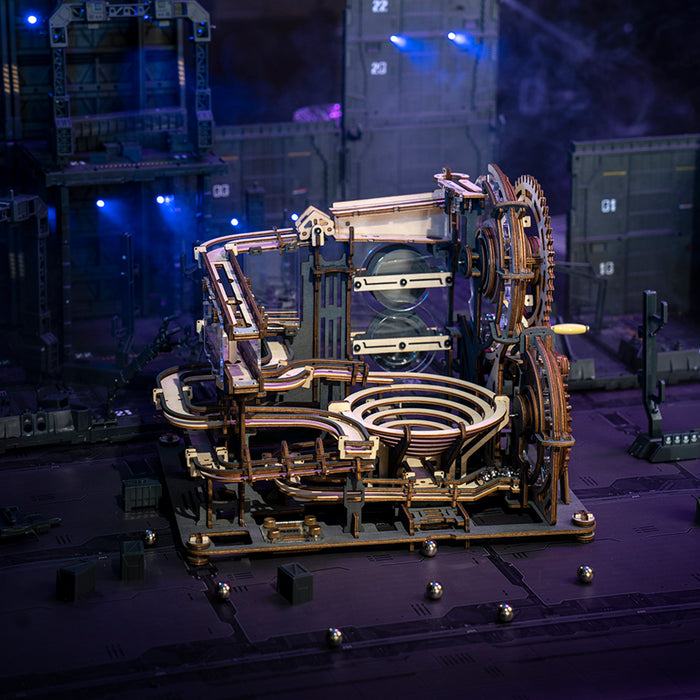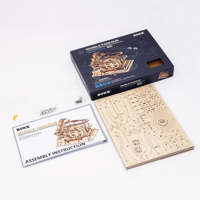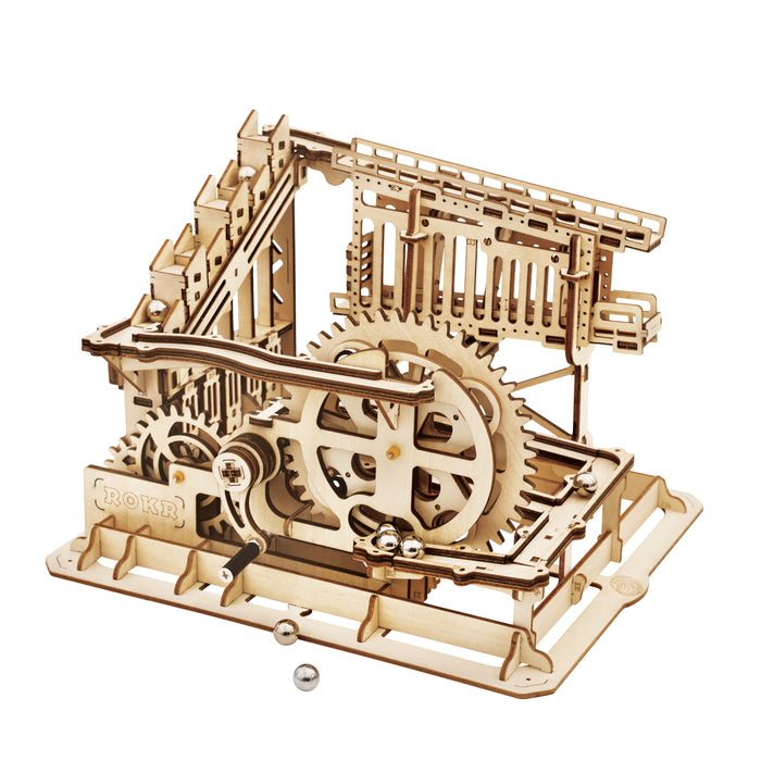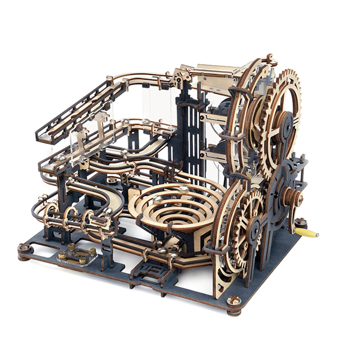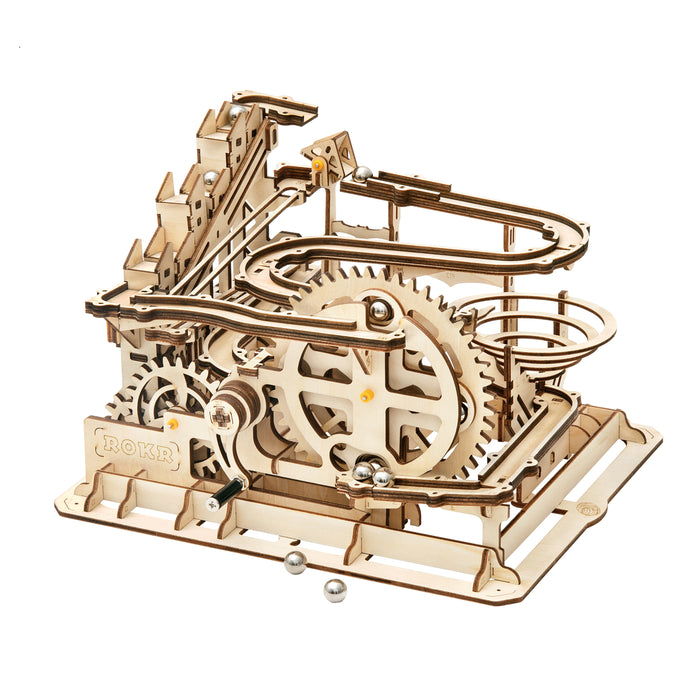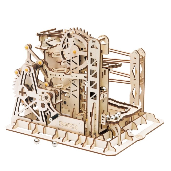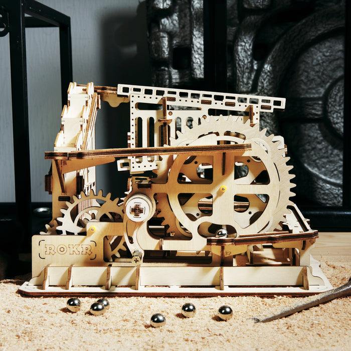 This set contains everything you need to build a fascinating mechanical marble run from pre-cut wooden parts! As soon as you turn the crank, shiny metal marbles are transported to the start and the whole track comes to life! Thanks to its comparatively small size, the marble run fits on even the smallest desk and makes a great decoration.