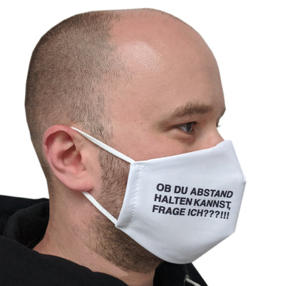 Diese Stoffmaske wurde in Deutschland hergestellt und lässt sich blitzschnell aufsetzen, um anderen Leuten zu sagen, DASS SIE VERDAMMT NOCHMAL ABSTAND HALTEN SOLLEN! Da sowohl Mund als auch Nase bedeckt werden und die Maske somit als „Alltagsmaske“ gilt, kannst Du Dich damit auch zum Einkaufen und in den öffentlichen Nahverkehr wagen. Für den perfekten Sitz sorgen die Gummibänder für die Ohren. Die Maske kannst du selbstverständlich auch nach dem Tragen bei 60°C waschen.