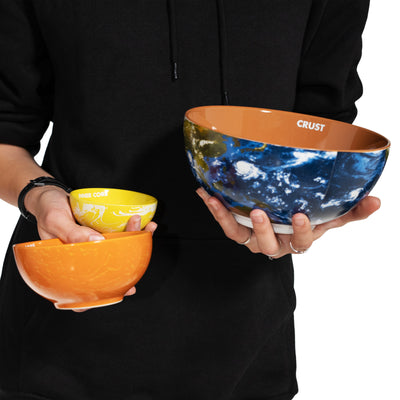 Keine Sorge, das ist nicht die neueste Flat Earther-Verschwörungstheorie oder irres Gerede – es geht um das Schüssel-Set Schalenbau der Erde. Dieses Set basiert auf einem Querschnitt der Erde: Von außen nach innen gibt es die Erdkruste, den Erdmantel, und den äußeren und inneren Erdkern als farbenfrohe Keramikschüsseln. Jede Schüssel ist bekannten Darstellungen des Schalenbaus der Erde farblich nachempfunden und mit einem simplen Muster verziert, wobei sich auf der Erdkruste natürlich ein realistischer Druck der Erdoberfläche befindet. Um es ganz deutlich zu machen, ist auf allen Schüsseln auch die Bezeichung der jeweiligen Schicht aufgedruckt.