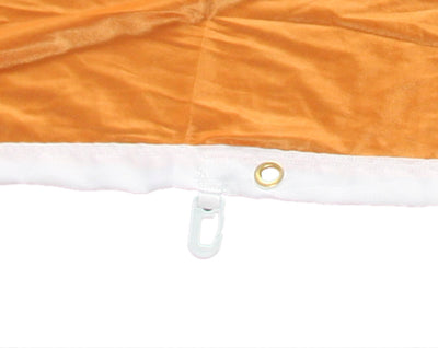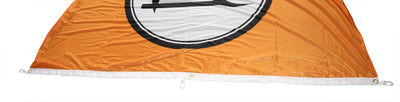 Hecha de poliéster y equipada con tres ganchos de plástico en el borde izquierdo y tres ojales de metal para facilitar la fijación. La impresión se ve a través de la bandera, por lo que aparece en espejo desde un lado. La bandera es adecuada para uso exterior. La entrega se realiza sin el asta de la bandera, pero se puede fabricar fácilmente uno mismo, la fijación es fácil con los ganchos de plástico o los ojales.
