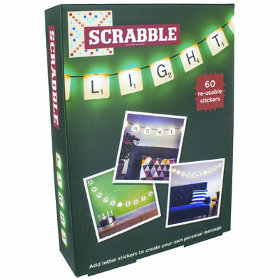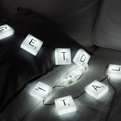 Contenido: cadena ligera con 10 luces en forma de juegos de scrabble, cable USB, adaptador de conector, 60 pegatinas de letras reutilizables