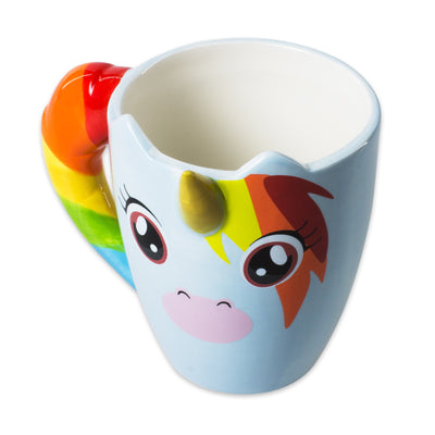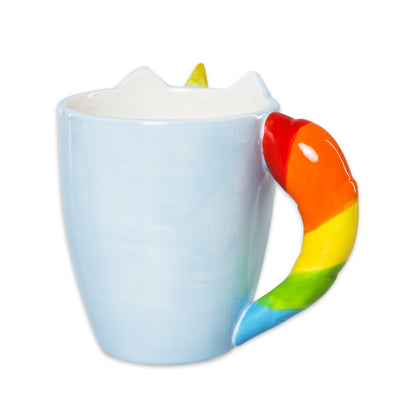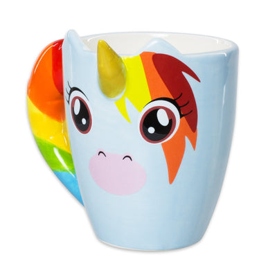 Bien sûr, les animaux mythiques ultimes et leurs fans méritent aussi une coupe ultime : la coupe de l'ultime. Gobelet Licorne arc-en-ciel! Ce gobelet imprimé tout autour brille d'un bleu céleste et montre le portrait d'une vraie licorne, qui fait preuve d'un style à la puissance dix avec sa touffe de cheveux audacieuse et sa queue arc-en-ciel. Mais il y a encore plus à découvrir : L'adorable licorne possède une corne tridimensionnelle qui dépasse du gobelet et qui invite littéralement à y placer des cuillères en équilibre, à y attacher des sachets de thé et à y accrocher des alliances. Comme tu peux le constater, les licornes peuvent également être très convaincantes dans le domaine des objets ménagers.