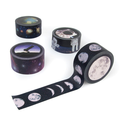 Solche extremen Situationen wirst du mit dem Weltraum Klebeband hoffentlich nicht lösen müssen. Wenn Geschenke eingepackt, Kalender oder Notizbücher dekoriert oder sonstige Alltagsprobleme gelöst werden müssen, kann aber auch dieses Klebeband die Rettung sein. Ein Set enthält gleich vier spacige Motive, wie Astronauten, Sterne oder die Mondphasen.