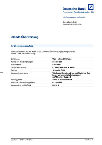 Les commandes ont été si nombreuses que nous avons pu faire un don de 7500 euros (!) à Wikileaks! Vous pouvez trouver le reçu sous "autres images". Si vous souhaitez faire un don supplémentaire, vous pouvez le faire ici.