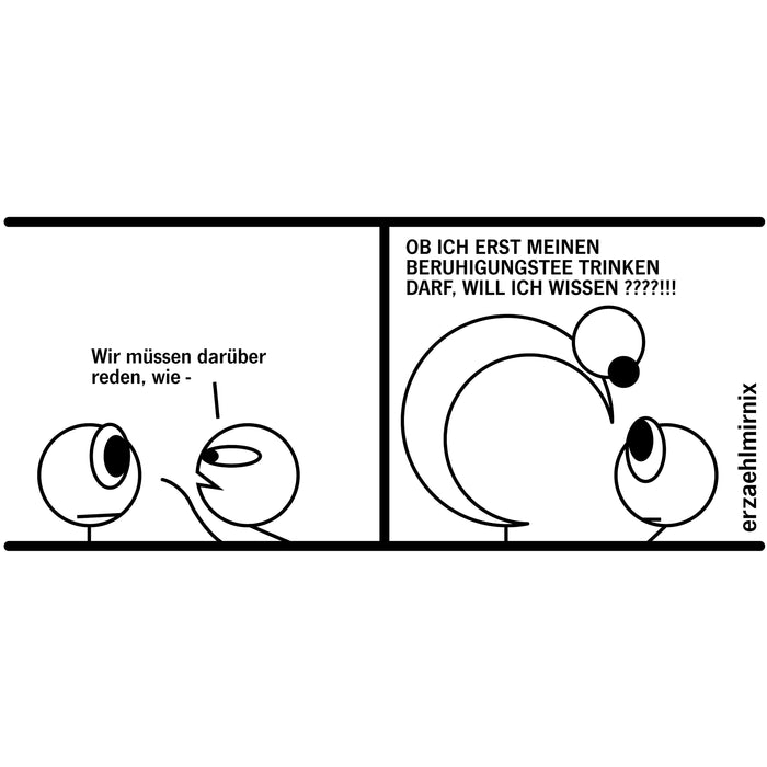 Le problème avec les thés calmants, c'est qu'ils doivent être bus en silence. Et ensuite, le corps doit l'absorber tranquillement. Tu vois, c'est "en silence" qui compte ! Mais comme le montre le gobelet erzaehlmirnix "thé calmant", tout le monde ne respecte pas cette règle non écrite de la vie en commun. C'est pourtant très simple : se taire jusqu'à ce que le thé calmant soit bu. Puis, pour plus de sécurité, se taire encore plus longtemps. Et ensuite, attendre jusqu'à la fin de la journée ;)