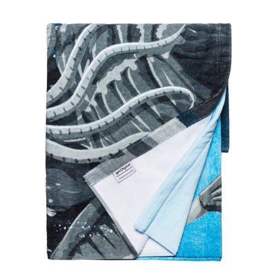 Dieses flauschige Tuch zeigt deutlich, dass unser Meister erwacht und bereit ist, seinen rechtmäßigen Platz als Herrscher der Erde einzunehmen. Wie, Du findest, dass es so aussieht, als ob Cthulhu die ahnungslose Schwimmerin verschlingen will? Ach was, Du denkst sicher an den weißen Hai. Bevor sich Deine Anti-Cthulhu Fake News weiterverbreiten, möchten wir klarstellen: Der Große Alte feuert lediglich seine Untertanin an, schneller zu schwimmen. Das kann doch nun wirklich jeder sehen...