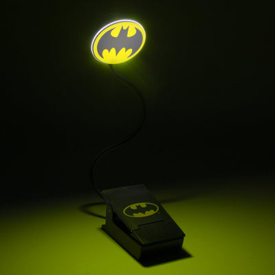 Die DC Comics Batman Batsignal Leselampe wirkt als käme sie direkt aus Bruce Waynes persönlichem Bestand an technischem Schnickschnack. Sie lässt sich nämlich sowohl am Buch selbst, als auch an einem dünnen Regalbrett, Bettgestell oder ähnlichem befestigen und dank ihrer Batterien (nicht enthalten) überallhin mitnehmen. Den flexiblen Arm kannst du so einstellen, dass das Bat-Signal genau dorthin leuchtet, wo du es brauchst – ob auf den Seiten oder an der Zimmerdecke. Angeblich schreckt es auch nörgelnde Eltern oder Mitbewohner ab, die dich dazu überreden wollen, endlich das Licht auszumachen! ;)