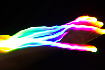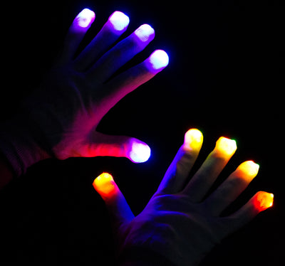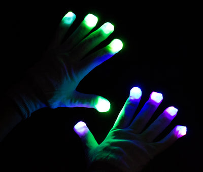 Essendo bianchi, i guanti LED brillano particolarmente bene alla luce nera, ma ovviamente non è tutto. I LED sono cuciti sulla punta delle dita e possono illuminarsi e lampeggiare in diversi colori.