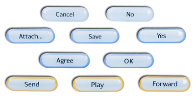 Un set è composto da 10 spille, tra cui le etichette "Annulla", "No", "Salva", "Allega...", "Sì", "Accetta", "OK", "Invia", "Riproduci" e "Avanti".