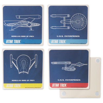 De "Star Trek TOS"-keramische onderzetters tonen twee van de bekendste ruimteschepen die de schermen van deze wereld onveilig hebben gemaakt: de USS Enterprise (NCC-1701) en de Romulan Bird of Prey. Op de robuuste keramische onderzetters, die niet alleen het Trekkie-niveau van elke woning exorbitant verhogen, maar ook nog eens tafels en dergelijke beschermen tegen vlekken, zijn de twee schepen vanuit twee perspectieven te zien. De gekleurde sierkanten zijn geïnspireerd op de uniformkleuren van de Enterprise. Zou iemand dan vrijwillig de rode onderzetter willen nemen?