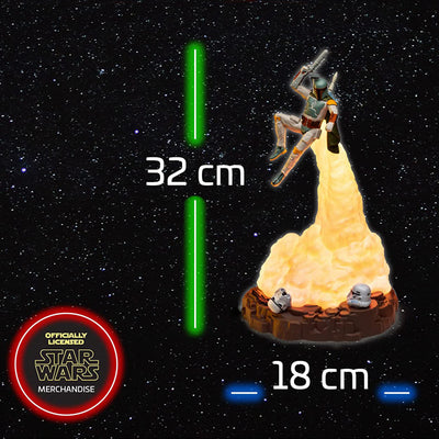 With the Star Wars The Book of Boba Fett Diorama Lamp, a monument has been created that shows him in the midst of a victorious battle against the stormtroopers. Of course, he wears his father's armor, even though he can easily take on several Imperials at once in a simple black robe. However, he couldn't light up your apartment with that. For this, he needs the powerful recoil of his jetpack. And while Boba Fett is already flying towards his next mission, the helmets of the stormtroopers remain useless on the ground. Well – not entirely useless! After all, one of them serves as a regulator for the brightness of the lamp, which has three levels.