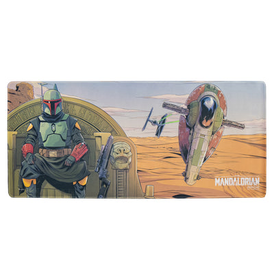 Da ist es nur logisch, dass einer der gefürchtetsten Kopfgeldjäger der Galaxis auf dieser Mousemat zu sehen ist, schließlich ist Boba Fett bekannt dafür, seinen Blaster besonders schnell zu zücken. Und weil dieses Mousepad extra breit ist, hat auch noch sein Schiff, die Slave I, Platz darauf gefunden.