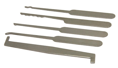 Specifically, the following tools are included in the set: hook, half-diamond, saw, snake, and tension wrench.