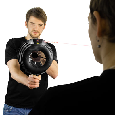 For better aiming, the new model of the Airzooka has a built-in laser. Just like every devastating weapon in good action movies. :) This way, you can precisely target your next victim - but never shine it in their eyes!