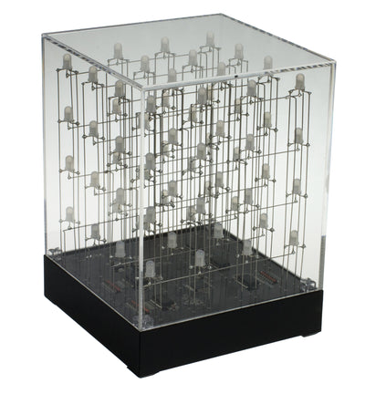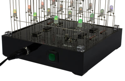 Even when turned off, the LED cube is a beautiful sight for many geeks: Above a shiny black base, the LEDs are arranged in a cube shape (4x4x4) on a mesh of wire. The wires are not insulated or otherwise hidden, all solder joints are visible and the switching elements on the base are also not covered. The delicate structure is only enclosed by a removable plexiglass cover, which is of course transparent.
