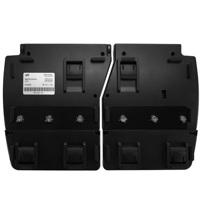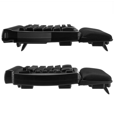Both parts are equipped with gel pads for the palms of your hands. This protects your wrist and nerves and your hands simply don't get tired as quickly when typing. If you prefer to type without them, you can also remove the pads. With the fold-out feet, the keyboard can be tilted forwards, backwards or outwards by 4.5° or jacked up a little (see photos). The steel plate makes the keyboard particularly robust.