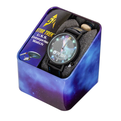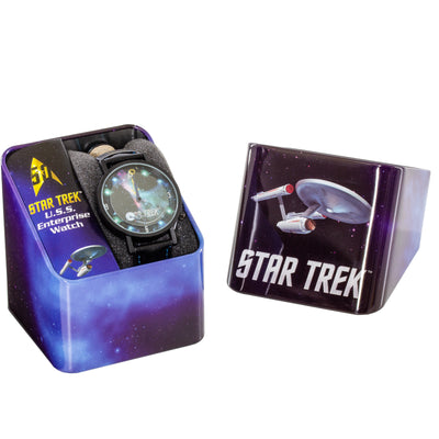 But the Star Trek wristwatches are not just plain timepieces; they are a concentrated dose of science fiction with real spaceships! In the case of the Enterprise wristwatch, the USS Enterprise circles around the dial alongside the hour and minute hands!
