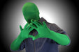 The chic green three-piece suit we have for you here has a huge advantage: it's a three-piece suit and not a jumpsuit (did we mention that?)! This means that you can wear your normal clothes and then simply cover the rest - usually your hands and head - with the green fabric. The gloves are approx. 51 cm long and reach up to the elbow. The headgear doesn't stop at the chin either, but falls almost over the shoulder so that a normal neckline is also covered.